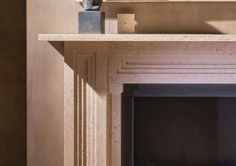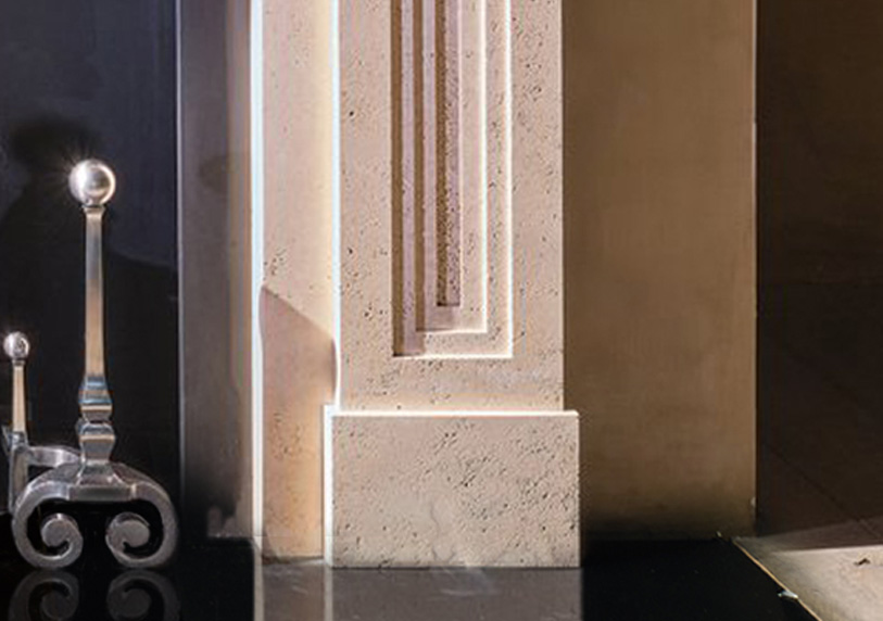 With elements both rough and refined, the Homer uniquely captures antiquity and modernity. This mantel’s strong architectural form is executed in unfilled Ivory Travertine.