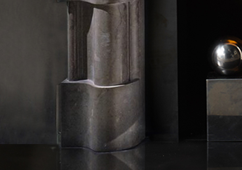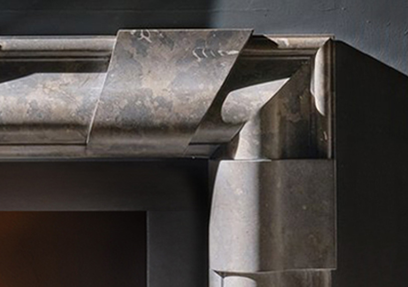 The Paxton is a robust design of highly unusual form with quoins inserted within the frame of a traditional bolection frame, giving the surround presence and heft. It is seen here carved in polished Azul Valvende limestone together with Soho Fire basket and Spherical Dogs.