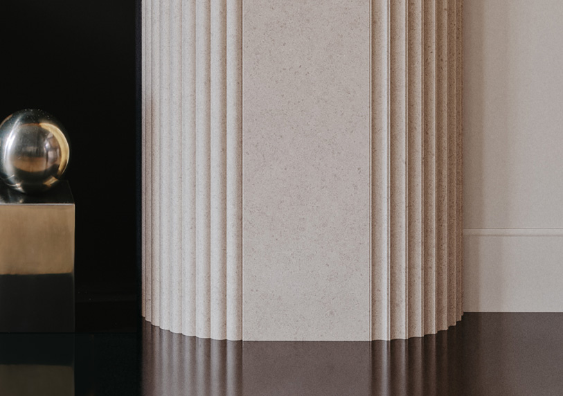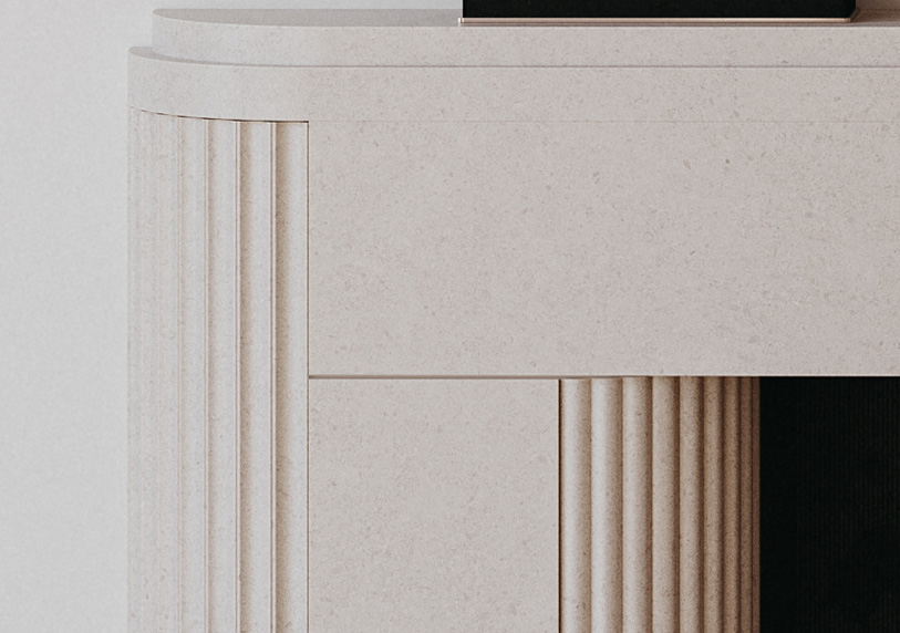 This substantial mantelpiece is both simple and striking in form. Its plain jamb panels are elaborated with reeded demilune panels adjacent to the fire chamber, which carving detail is mirrored in conforming vertical flutes externally. A receding, stepped shelf completes this Art-Deco-inspired silhouette.