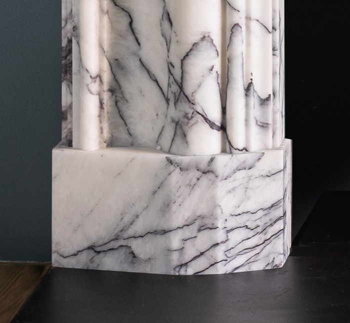 The Milo is a fire surround of substantial proportions that features an elegant bolection moulded frame elevated above canted block feet. Shown here in Lilac marble from Antalya in Turkey.