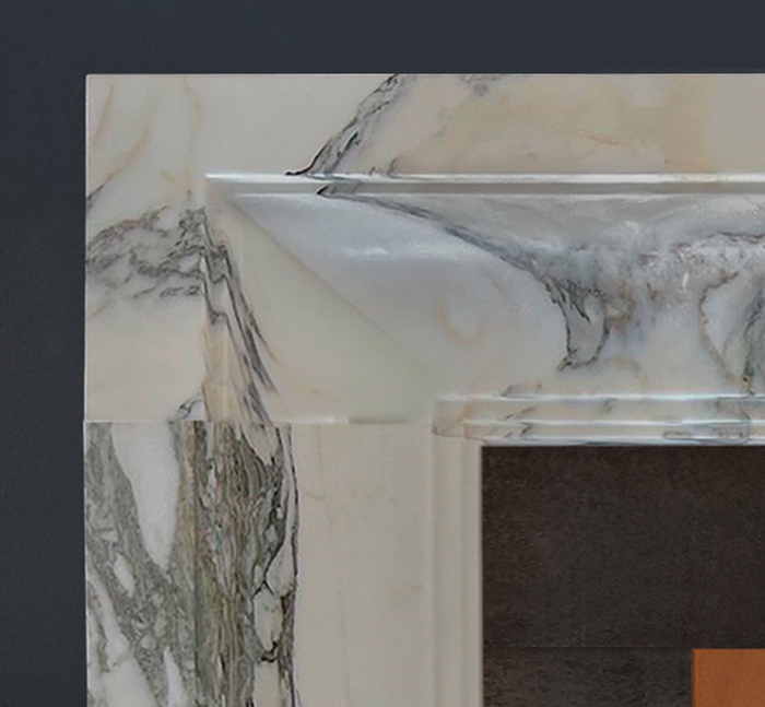 Seen here in Arabescato marble, The Scarpa has the elegance of an Art Deco design carefully selected for its delicate horizontal striations and cut from the block to provide a book matched effect on the two pilasters.
