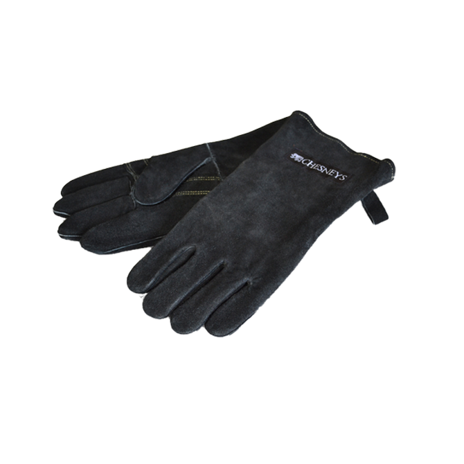 Branded leather wood burner gloves to provide protection when handling all controls and parts of all indoor and outdoor wood-burning appliances.